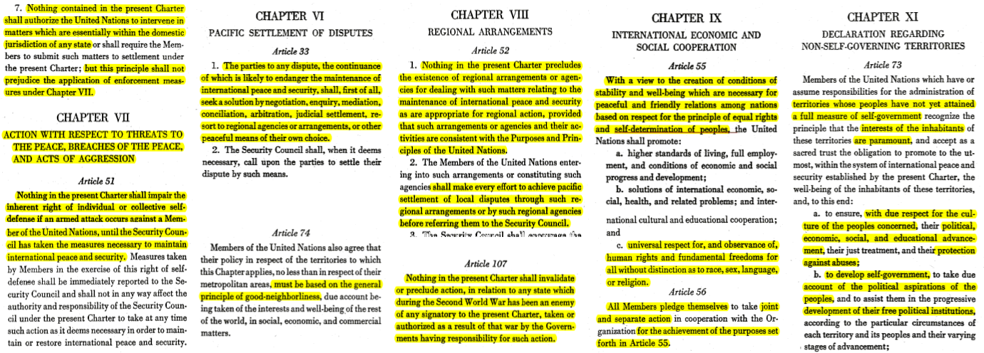 Dle mé analýzy, Rusko zasahuje na Ukrajině v souladu s Chartou OSN, články §107 (zásah proti poraženým mocnostem z 2.sv. války bez souhlasu RB OSN, protože Ukrajinci se přihlásili k Banderovcům, kteří bojovali na straně Německa), §2.7 s odkazem na §51 (právo na kolektivní sebeobranu), §33.1 (nejprve se budou snažit o vyjednávání), §52.1 (regionální akce na zachování míru a bezpečnosti - obrana ruských obyvatel Donbasu před dlouhotrvající Ukrajinskou agresí) a §52.2 (vyčerpá všechny snahy o mírové ujednání), §55 (respekt k rovným právům a sebeurčení lidu) a §55.c (respekt a dodržování lidských práv a základních svobod bez ohledu na rasu, jazyk nebo náboženství - což Ukrajina porušila a Rusko nyní vymáhá jako jednu z podmínek mírového ujednání, kterou ale Ukrajina tvrdošíjně brání obnovit na svém zbývajícím území) a §73.a (na územích, které ještě nemají uznanou vládu OSN, je třeba dodržovat respekt k jejich kultuře, politický a společenský rozvoj a ochrana před zneužíváními, protože zájmy tamního lidu jsou prvořadé, doslova „paramount“) a §73.b (snažit se tam zavést vlastní vládu podle politických aspirací tamního lidu a rozvoj svobodných politických institucí) - které byly psány pro svrhávání koloniálních nadvlád po 2.sv. válce...