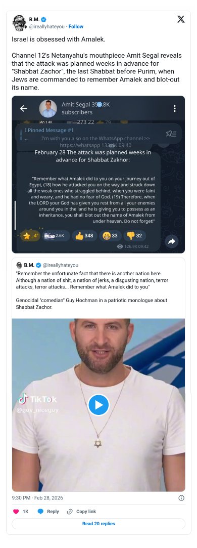 Izraelský premiér Benjamin Netanjahu zahájil izraelskou válku proti Gaze tím, že řekl Židům: “Musíte si pamatovat, co vám Amalek udělal,” a nyní se před Purimem zahajuje válka s Íránem, aby vyhladila perské “Amalekity.”